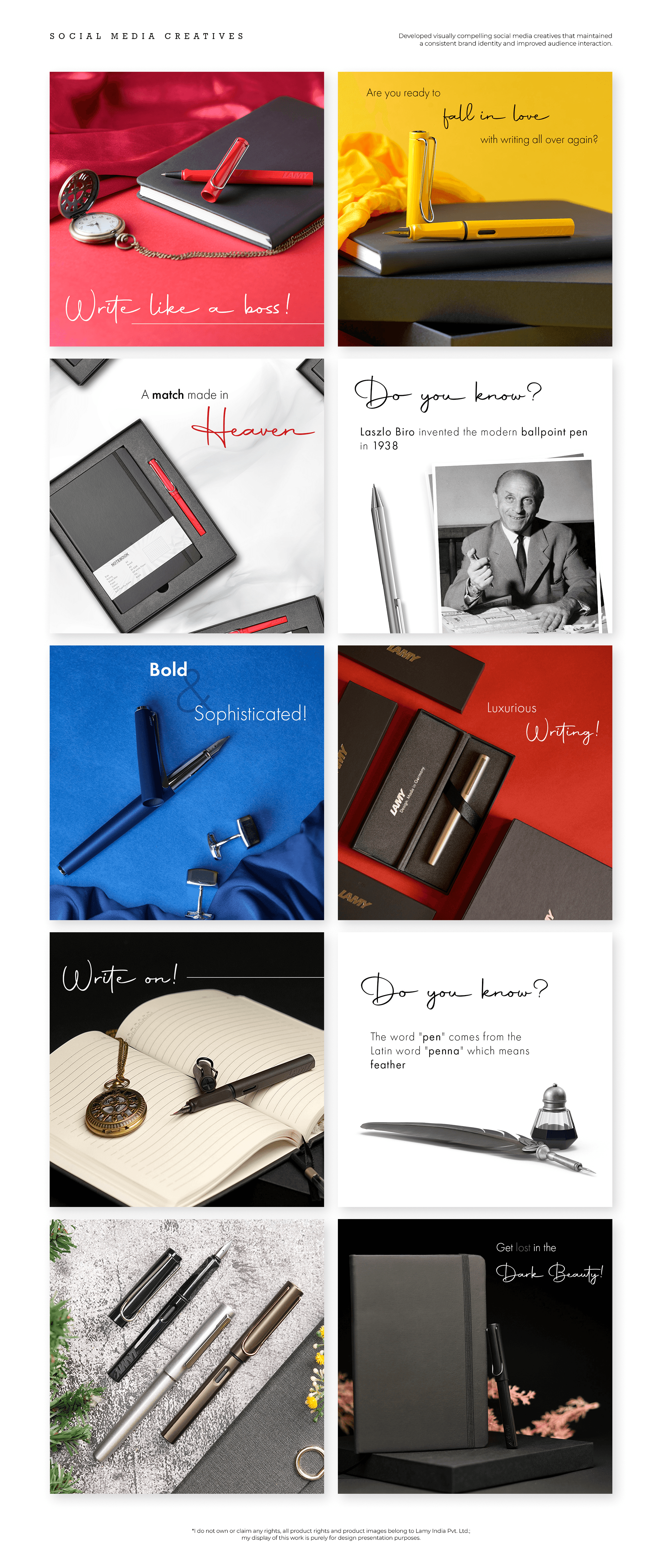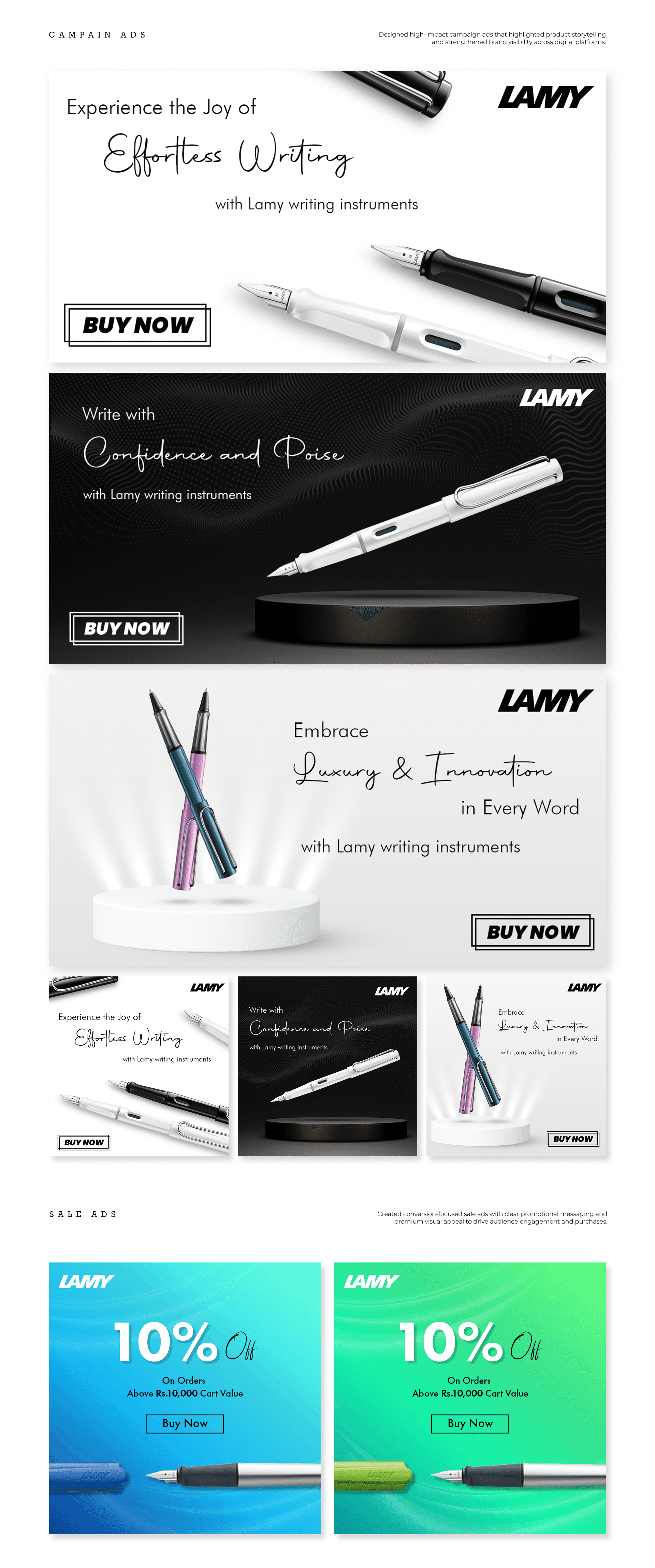 I had the opportunity to work with Lamy India, designing visual content for various campaign ads and sale-focused promotions across digital platforms. My work involved developing refined and minimalist graphics that captured the brand’s essence of precision, craftsmanship, and modern luxury. I worked closely with the marketing team to align creative direction with campaign goals and seasonal sale strategies, producing visually compelling assets that increased engagement and reinforced the brand’s luxury positioning. I also crafted social media creatives that highlighted product details and enhanced brand storytelling.